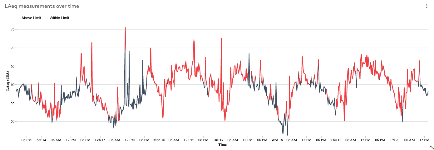 Prompt 2. “Noise limits in Geneva are: daytime (07:00-19:00): 60dBA, evening (19:00-23:00): 55dBA, night (23:00-07:00): 50dBA. Colour in red all measurements above limit.”
