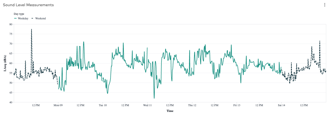 Prompt 1. “Show me the average noise level in the Geneva Cornavin area in April. Weekday measurements shown in teal and weekend measurements in grey.”