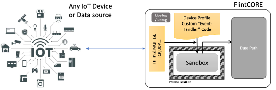 Built-in programming environment with secure sandboxed execution of custom “event handlers” — acting as a “driver layer” that enables integration with any device or data source, regardless of protocol.